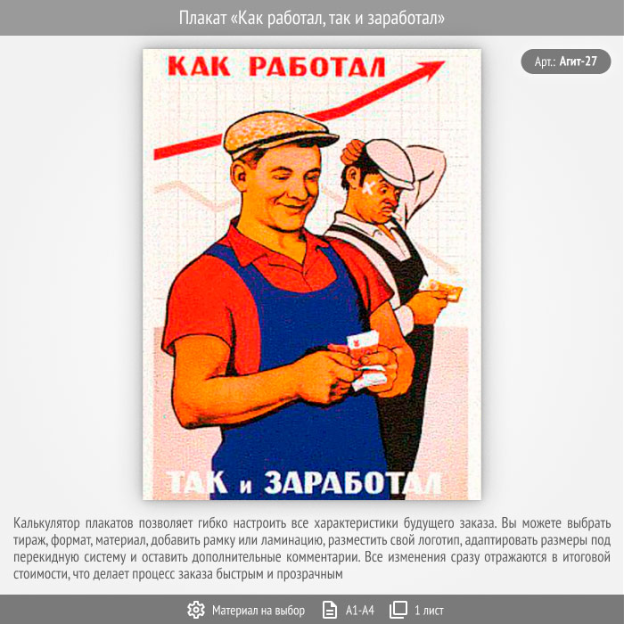 Плакат «Как работал, так и заработал» (Агит-27, 1 лист) в Обнинске купить