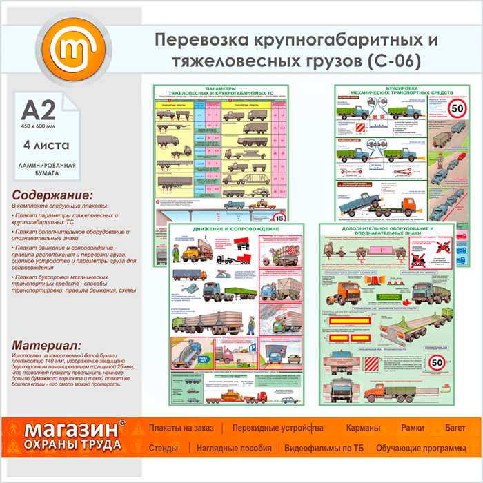 Плакаты «Перевозка крупногабаритных и тяжеловесных грузов» (С-06, ламинированная бумага, А2, 4 листа) в Обнинске купить