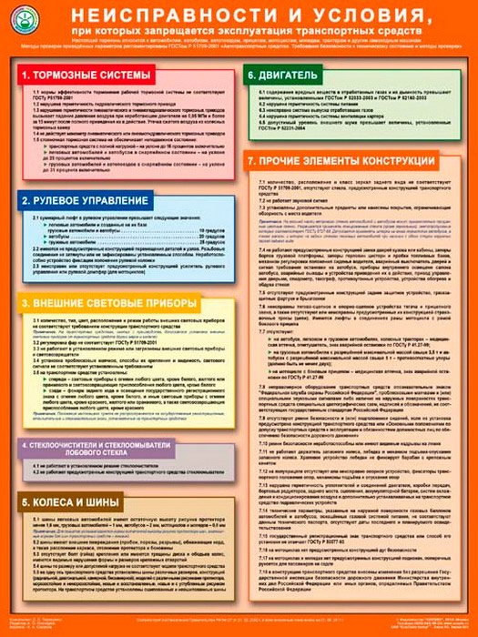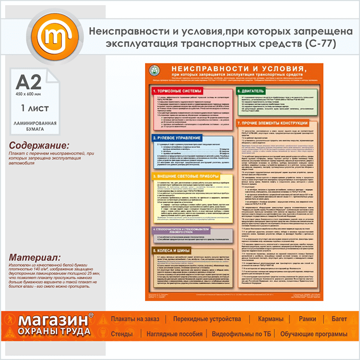 Плакат «Неисправности и условия, при которых запрещена эксплуатация транспортных средств» (С-77, ламинированная бумага, А2, 1 лист) в Обнинске купить