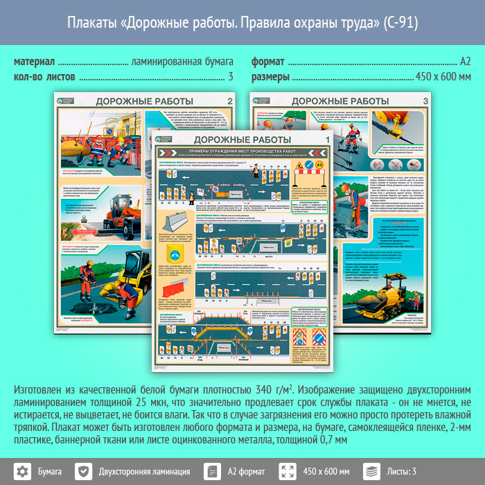 Плакаты «Дорожные работы. Правила охраны труда» (С-91, ламинированная бумага, А2, 3 листа) в Обнинске купить
