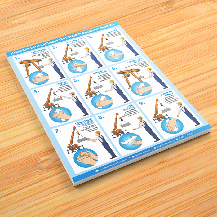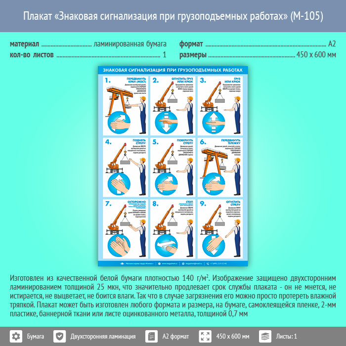 Плакат «Знаковая сигнализация при грузоподъемных работах» (М-105, ламинированная бумага, А2, 1 лист) в Обнинске купить