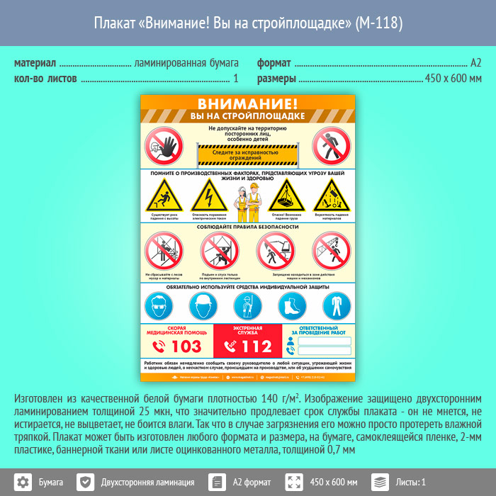 Плакат «Внимание! Вы на стройплощадке» (М-118, ламинированная бумага, А2, 1 лист) в Обнинске купить
