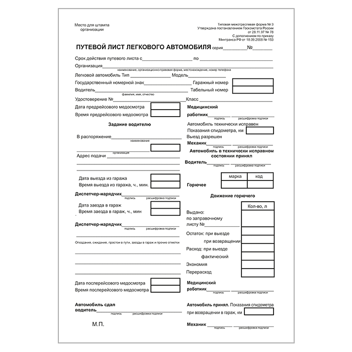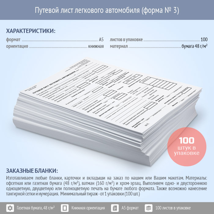 Путевой лист легкового автомобиля (форма № 3, упаковка из 100 штук) в Обнинске купить