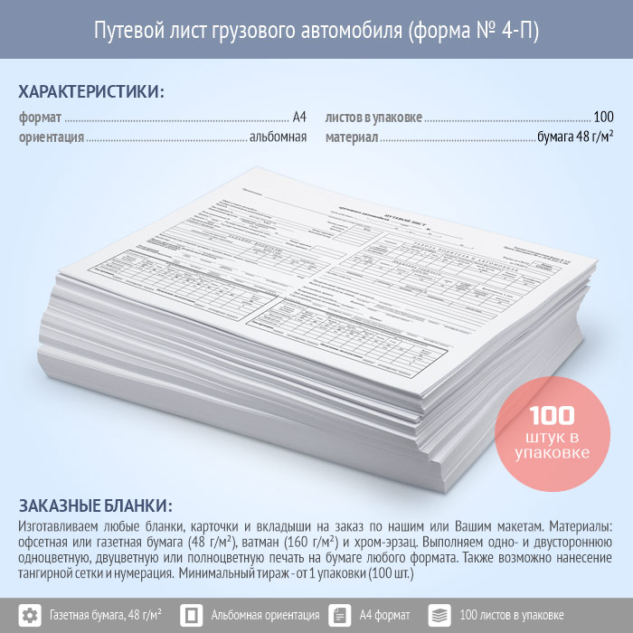 Путевой лист грузового автомобиля (форма № 4-П, упаковка из 100 штук) в Обнинске купить