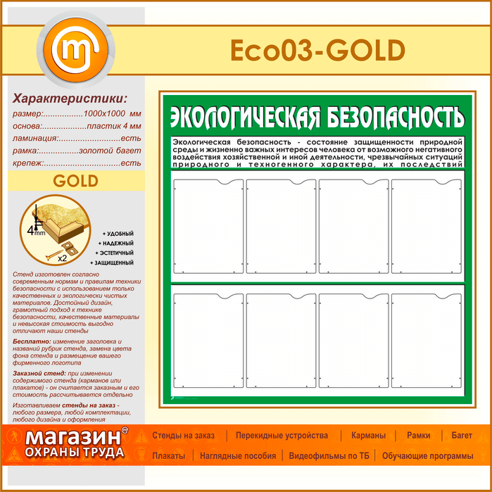 Стенд «Экологическая безопасность» с 8 карманами (ECO-03-GOLD) в Обнинске купить