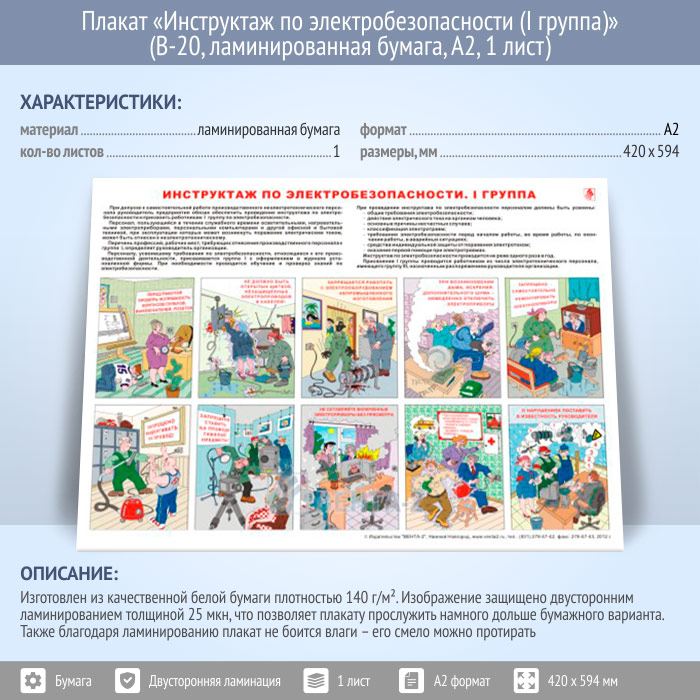 Плакат «Инструктаж по электробезопасности (I группа)» (В-20, ламинированная бумага, А2, 1 лист) в Обнинске купить