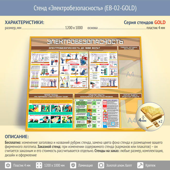 Стенд «Электробезопасность до 1000 вольт» с плоским и объемным карманами (EB-02-GOLD) в Обнинске купить