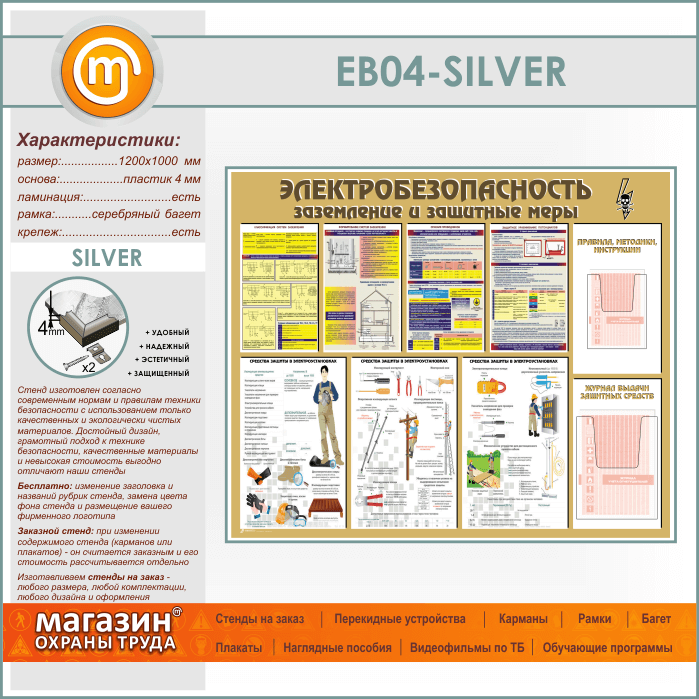 Стенд «Электробезопасность. Заземление и защитные меры» с 2 объемными карманами (EB-04-SILVER) в Обнинске купить