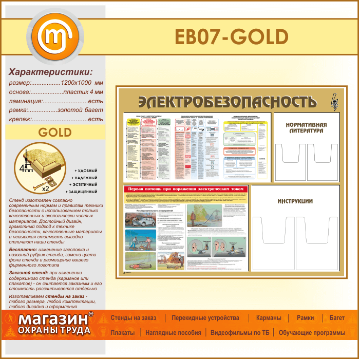 Стенд «Электробезопасность» с 4 объемными карманами (EB-07-GOLD) в Обнинске купить