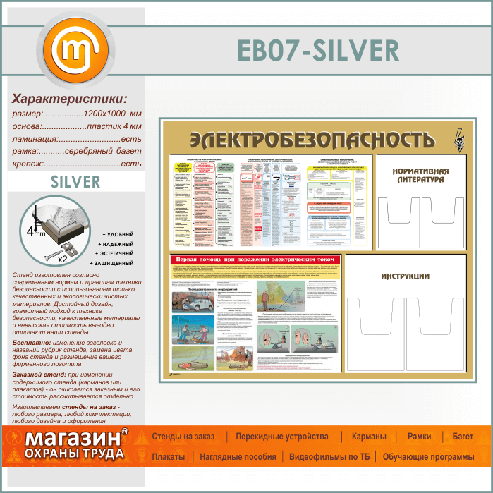 Стенд «Электробезопасность» с 4 объемными карманами (EB-07-SILVER) в Обнинске купить