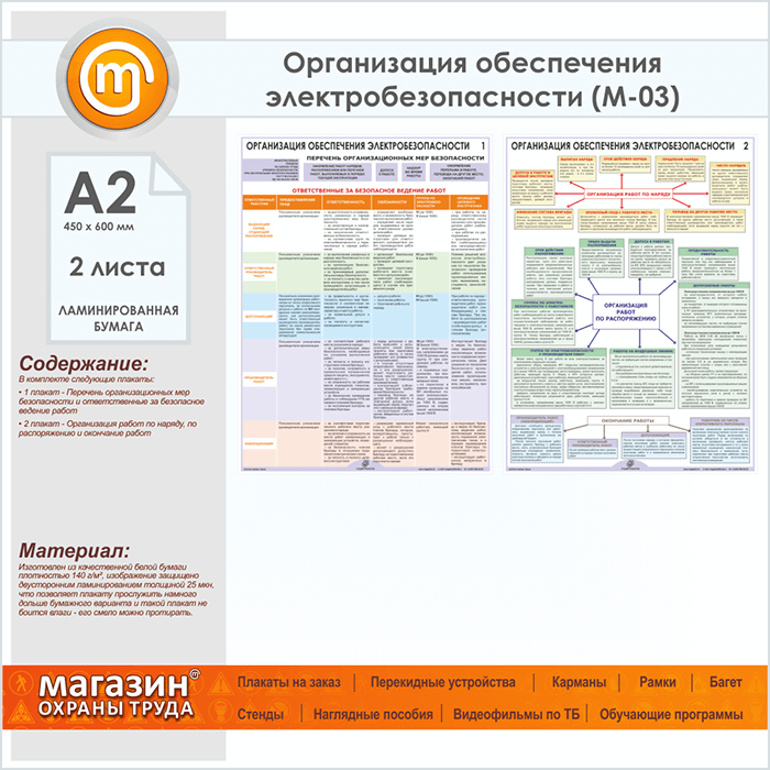 Плакаты «Организация обеспечения электробезопасности» (М-03, ламинированная бумага, А2, 2 листа) в Обнинске купить
