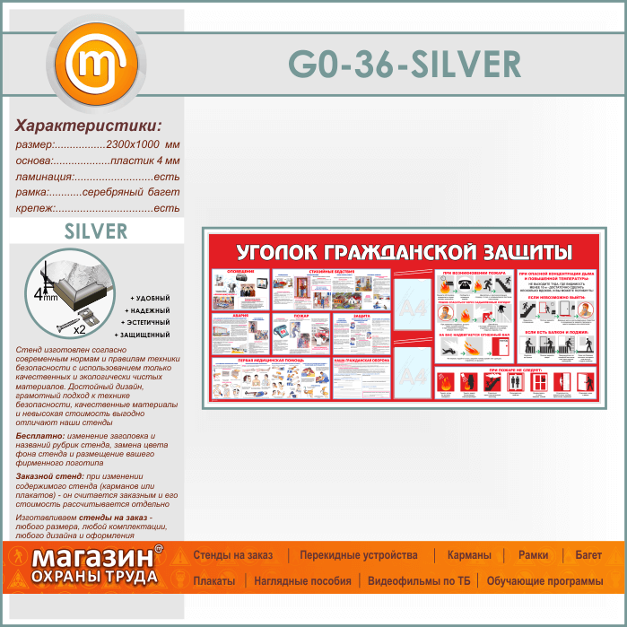 Стенд «Уголок гражданской защиты» c 2 карманами (GO-36-SILVER) в Обнинске купить