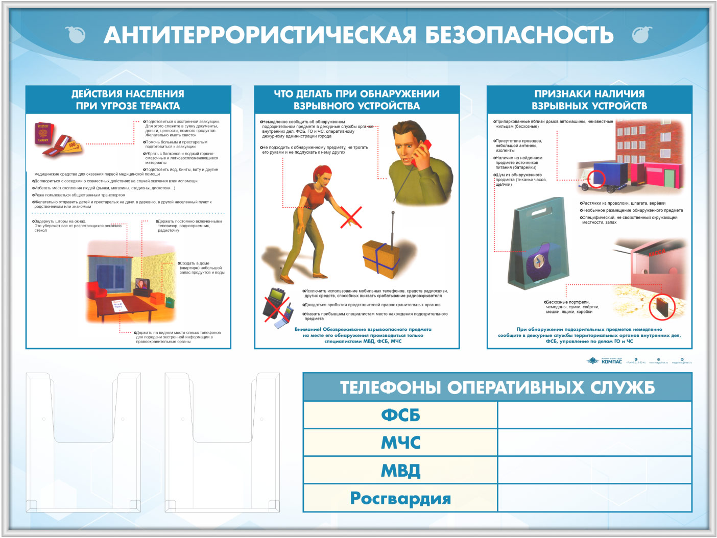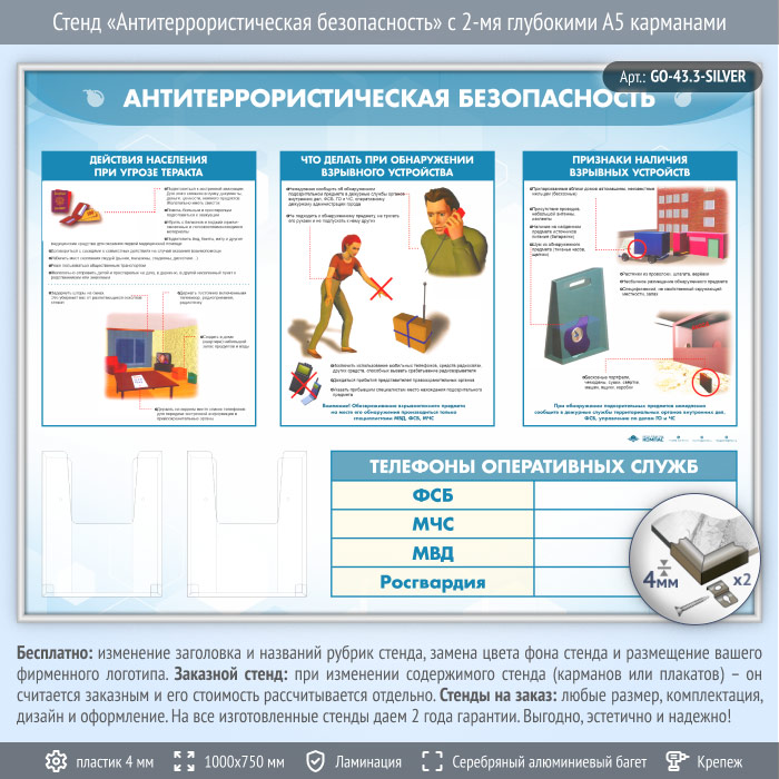 Стенд «Антитеррористическая безопасность» с 2-мя глубокими А5 карманами (GO-43.3-SILVER) в Обнинске купить