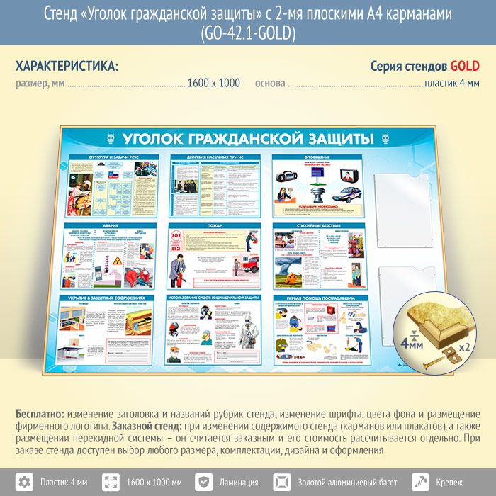 Стенд «Уголок гражданской защиты» с 2-мя плоскими А4 карманами (GO-42.1-GOLD) в Обнинске купить