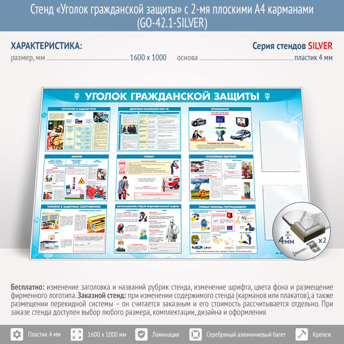 Стенд «Уголок гражданской защиты» с 2-мя плоскими А4 карманами (GO-42.1-SILVER) в Обнинске купить
