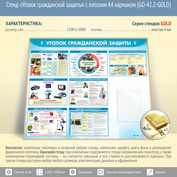 Стенд «Уголок гражданской защиты» с плоским А4 карманом (GO-42.2-GOLD) в Обнинске купить