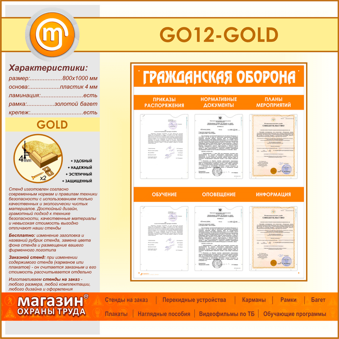 Стенд «Гражданская оборона» с 6 плоскими карманами (GO-12-GOLD) в Обнинске купить