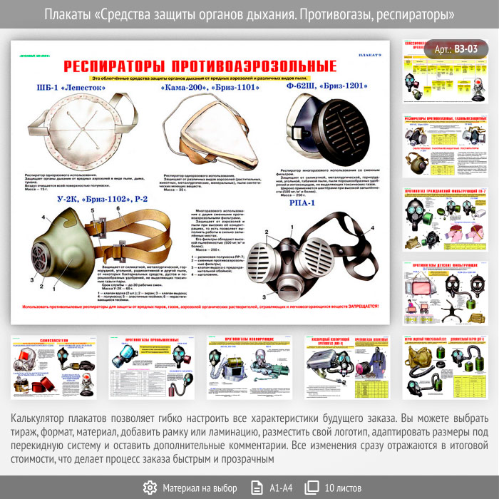 Плакаты «Средства защиты органов дыхания. Противогазы, респираторы» (ВЗ-03, 10 листов) в Обнинске купить