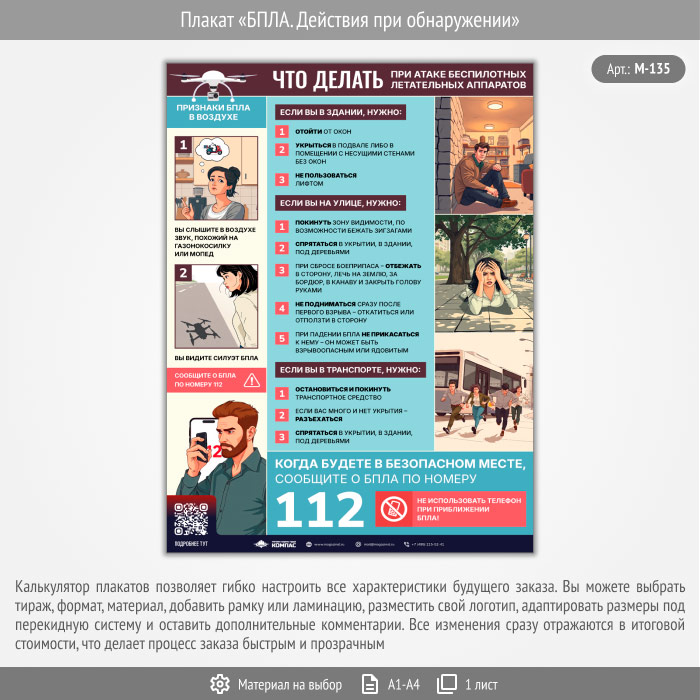 Плакат «БПЛА. Действия при обнаружении» с QR (М-135, 1 лист) в Обнинске купить