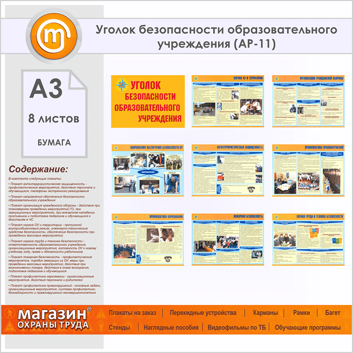 Плакаты «Уголок безопасности образовательного учреждения» (АР-11, бумага, А3, 8 листов) в Обнинске купить