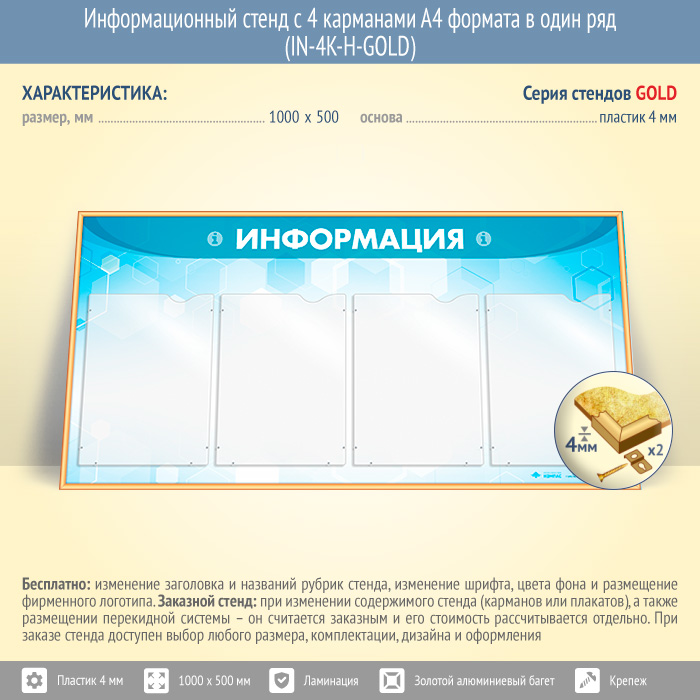 Информационный стенд с 4 карманами А4 формата в один ряд (IN-4K-H-GOLD) в Обнинске купить