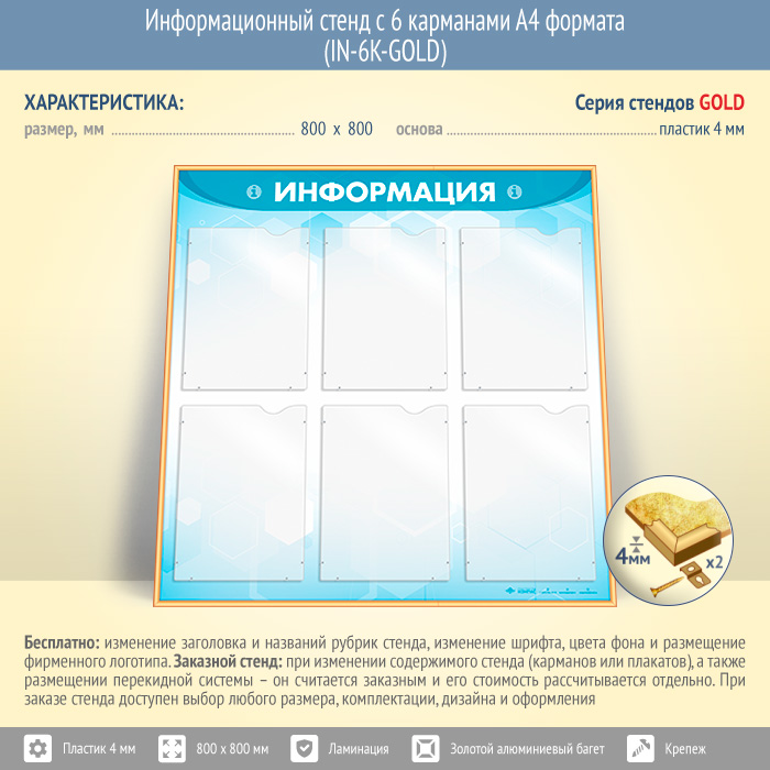 Информационный стенд с 6 карманами А4 формата (IN-6K-GOLD) в Обнинске купить