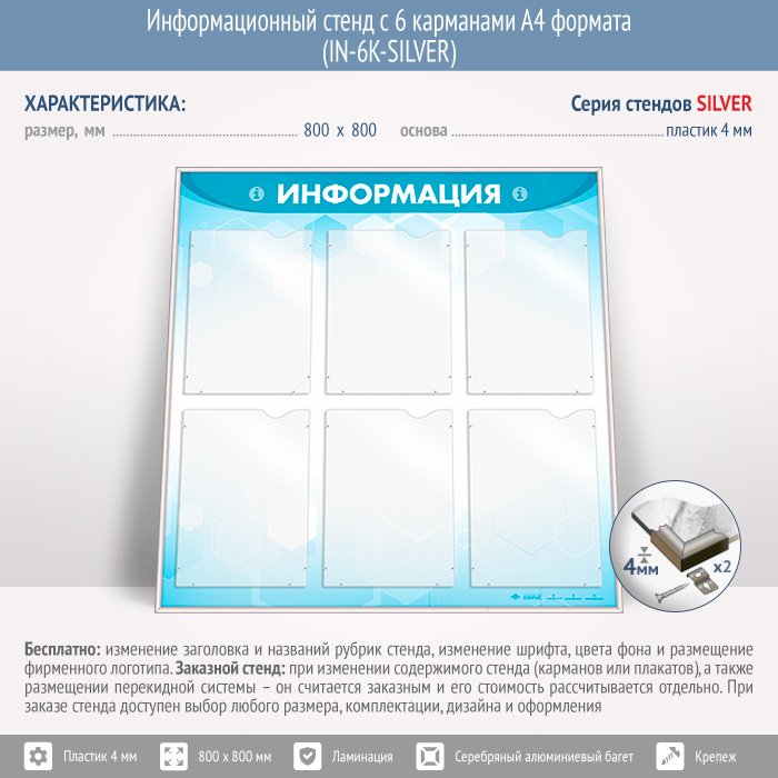 Информационный стенд с 6 карманами А4 формата (IN-6K-SILVER) в Обнинске купить