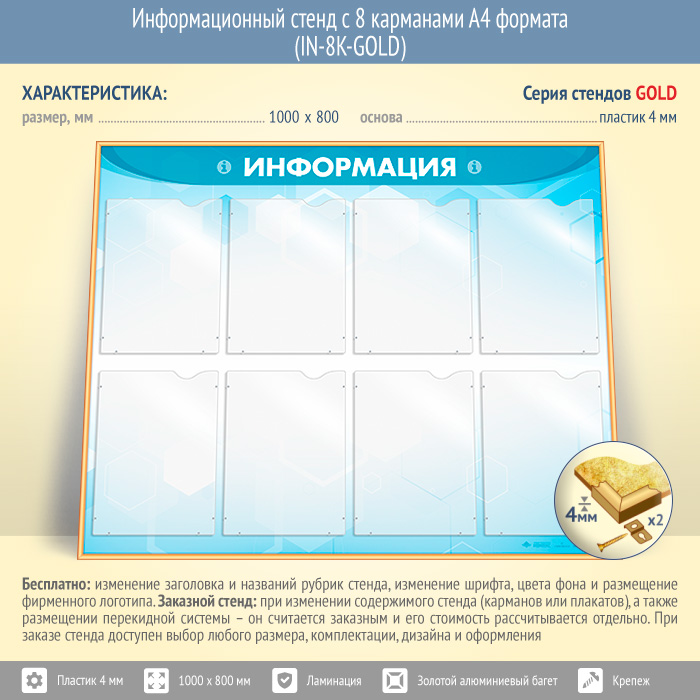 Информационный стенд с 8 карманами А4 формата (IN-8K-GOLD) в Обнинске купить