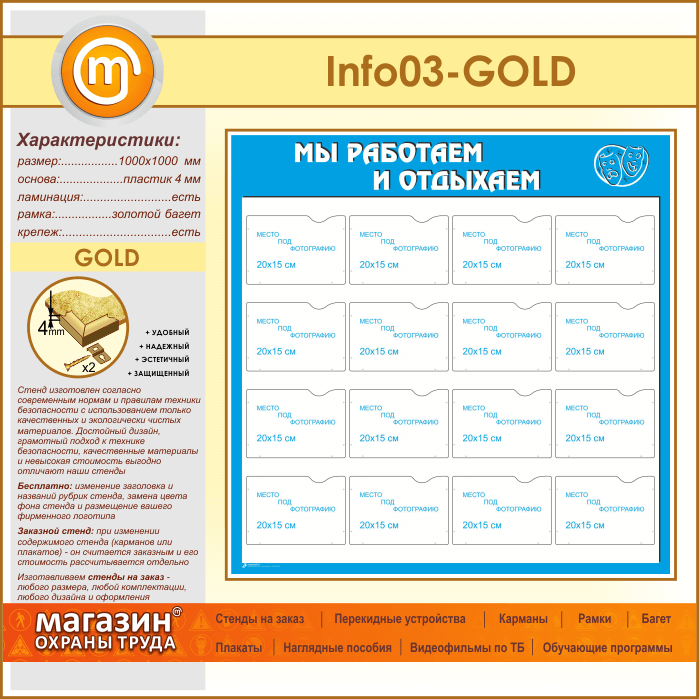 Стенд «Мы работаем и отдыхаем» с 16 карманами А5 формата (IN-03-GOLD) в Обнинске купить