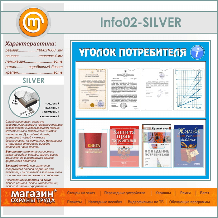 Стенд «Уголок потребителя» с 4 плоскими и 4 объемными карманами А4 формата (IN-02-SILVER) в Обнинске купить
