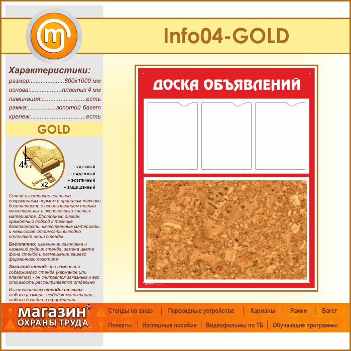 Стенд «Доска объявлений» с пробковым полотном и 3 карманами А4 формата (IN-04-GOLD) в Обнинске купить