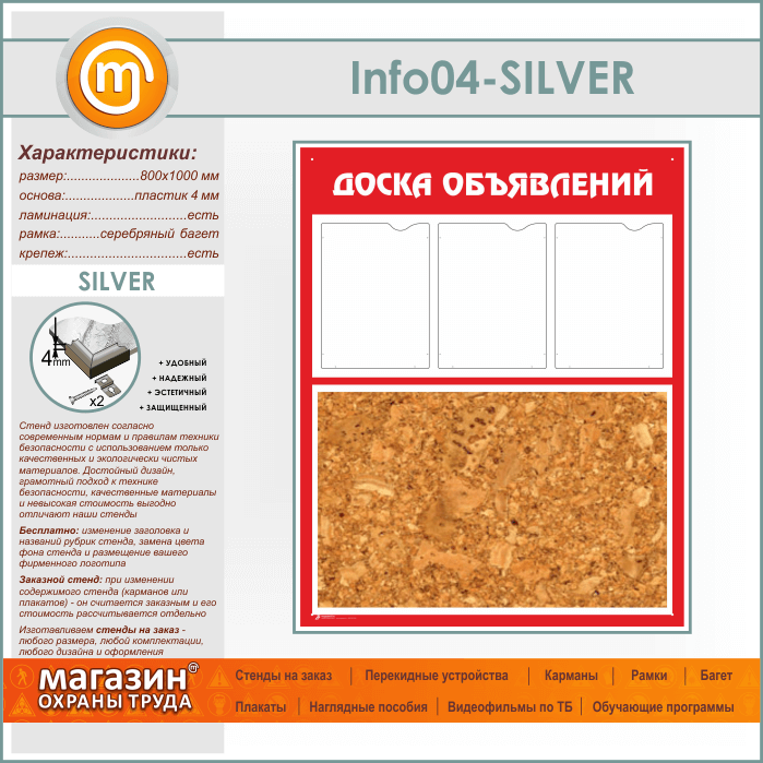 Стенд «Доска объявлений» с пробковым полотном и 3 карманами А4 формата (IN-04-SILVER) в Обнинске купить