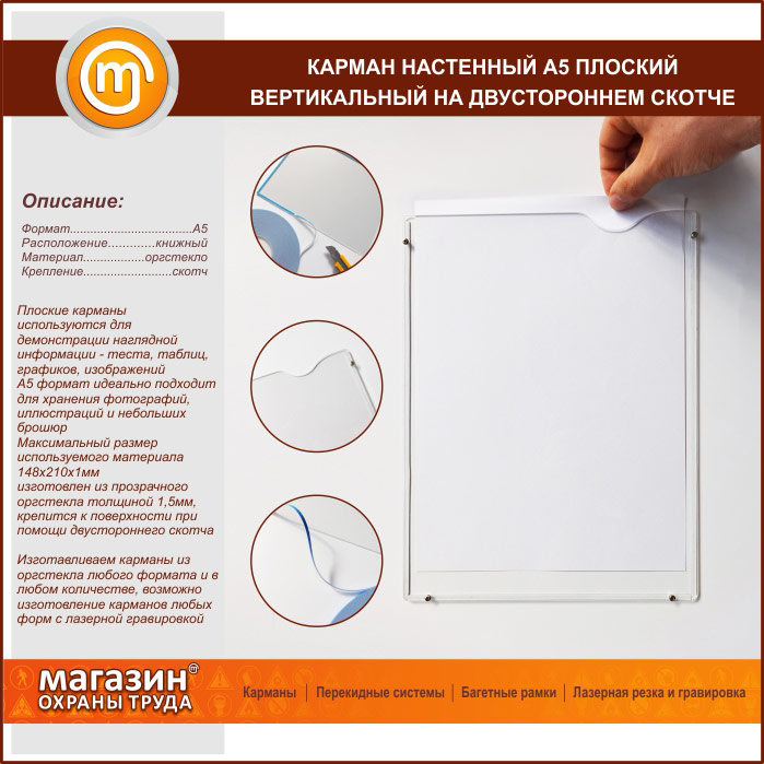 Карман настенный А5 плоский вертикальный на двустороннем скотче в Обнинске купить