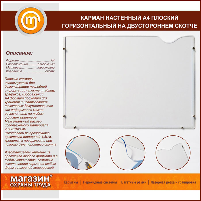 Карман настенный А4 плоский горизонтальный на двустороннем скотче в Обнинске купить