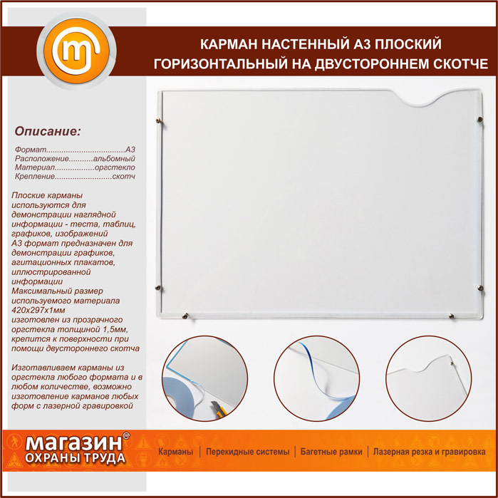 Карман настенный А3 плоский горизонтальный на двустороннем скотче в Обнинске купить