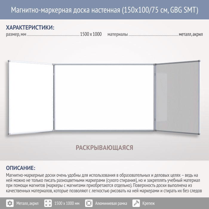 Магнитно-маркерная доска настенная (150x100/75 см, GBG SMT) в Обнинске купить