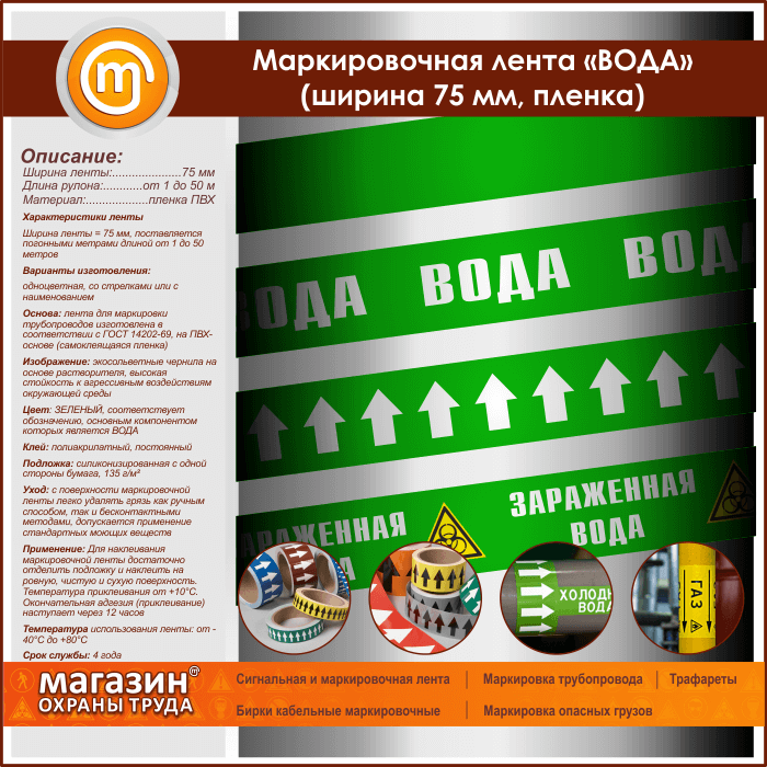 Маркировочная лента «ВОДА» (ширина 75 мм, самоклеящаяся плёнка) в Обнинске купить