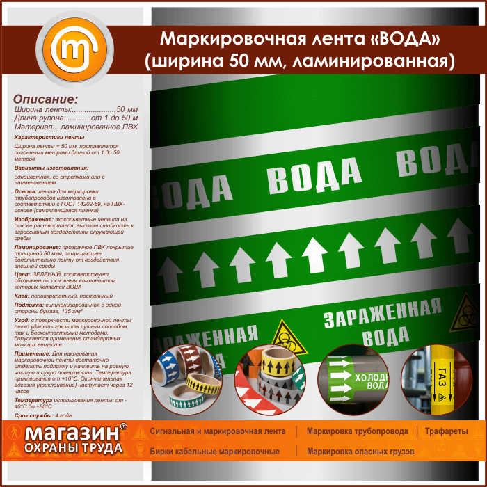 Маркировочная лента «ВОДА» (ширина 50 мм, самоклеящаяся плёнка с ламинированием) в Обнинске купить