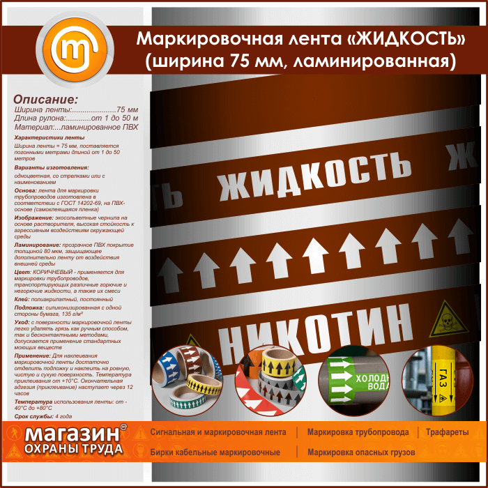 Маркировочная лента «ЖИДКОСТЬ» (ширина 75 мм, самоклеящаяся плёнка с ламинированием) в Обнинске купить