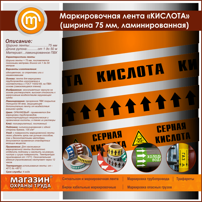 Маркировочная лента «КИСЛОТА» (ширина 75 мм, самоклеящаяся плёнка) в Обнинске купить