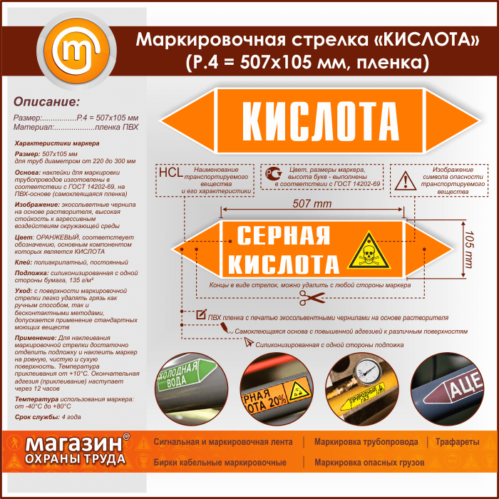 Маркировочная стрелка «КИСЛОТА» (P.4 = 507х105 мм, самоклеящаяся плёнка) в Обнинске купить