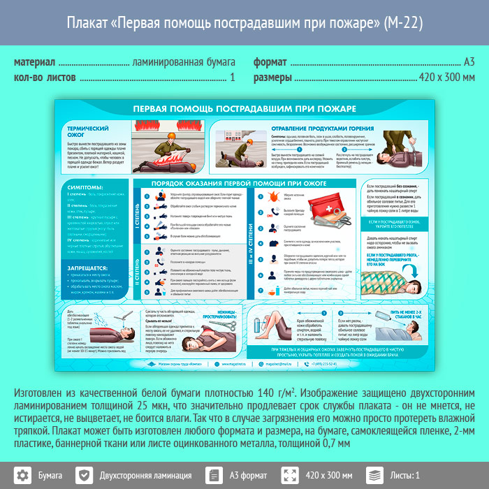 Плакат «Первая помощь пострадавшим при пожаре» (М-22, ламинированная бумага, А3, 1 лист) в Обнинске купить