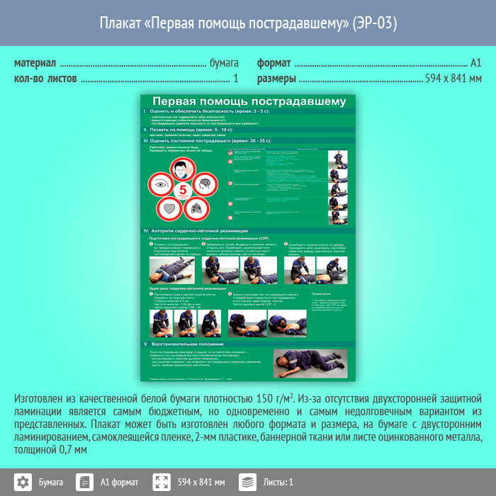 Плакат «Первая помощь пострадавшему» (ЭР-03, бумага, А1, 1 лист) в Обнинске купить