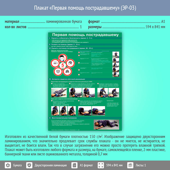 Плакат «Первая помощь пострадавшему» (ЭР-03, ламинированная бумага, А1, 1 лист) в Обнинске купить