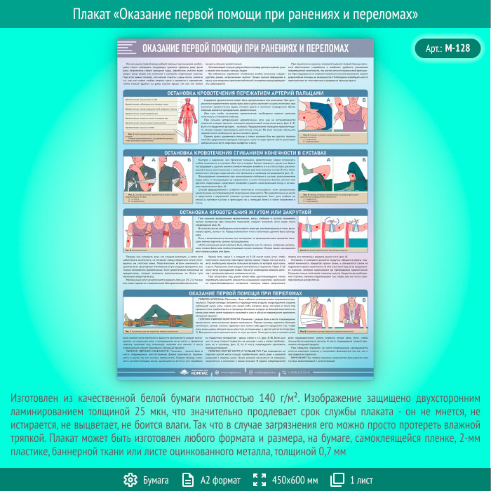 Плакат «Оказание первой помощи при ранениях и переломах» (М-128, ламинированная бумага, А2, 1 лист) в Обнинске купить