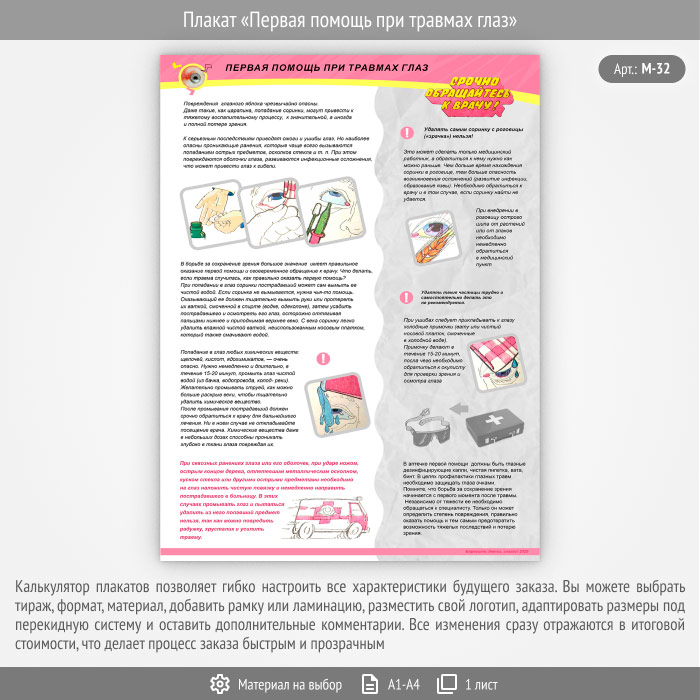 Плакат «Первая помощь при травмах глаз» (М-32, 1 лист) в Обнинске купить