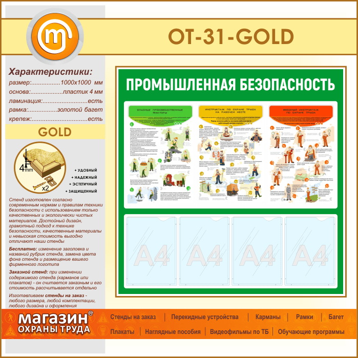 Стенд «Промышленная безопасность» с 4 карманами (OT-31-GOLD) в Обнинске купить