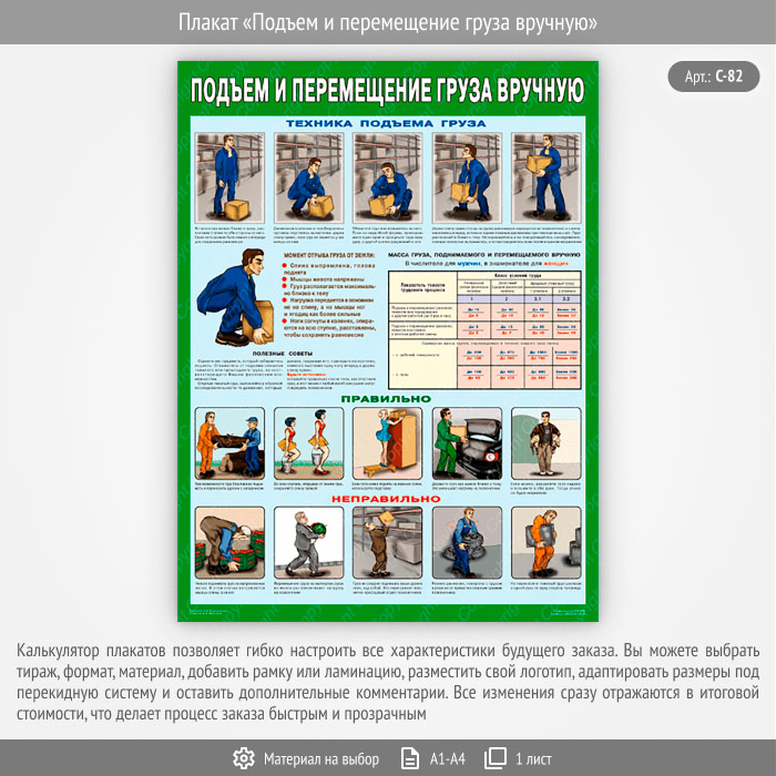 Плакат «Подъем и перемещение груза вручную» (С-82, 1 лист) в Обнинске купить