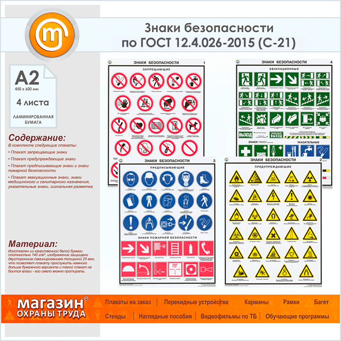 Плакаты «Знаки безопасности по ГОСТ 12.4.026-2015» (С-21, ламинированная бумага, А2, 4 листа) в Обнинске купить