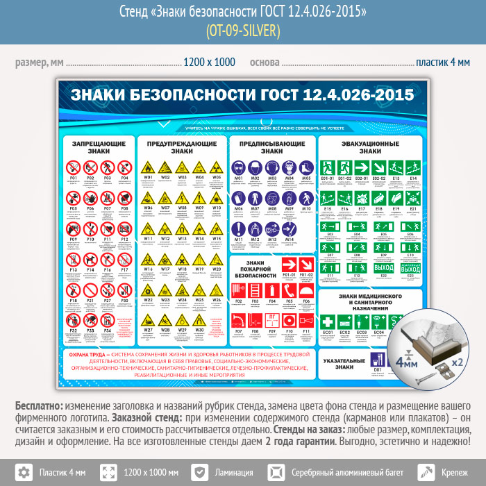 Стенд «Знаки безопасности ГОСТ 12.4.026-2015» (OT-09-SILVER) в Обнинске купить